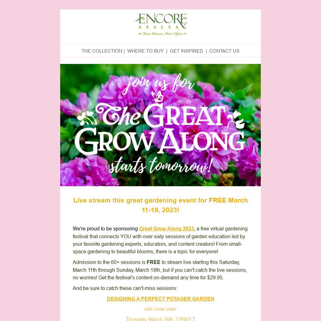 We're proud to be sponsoring Great Grow Along 2023, a free virtual gardening festival that connects YOU with over sixty sessions of garden education led by your favorite gardening experts, educators, and content creators! From small-space gardening to beautiful blooms, there is a topic for everyone!