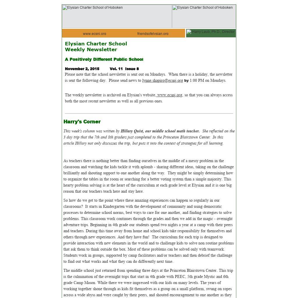The weekly newsletter is archived on Elysian's website, www.ecsnj.org, so that you can always access both the most recent newsletter as well as all previous ones.