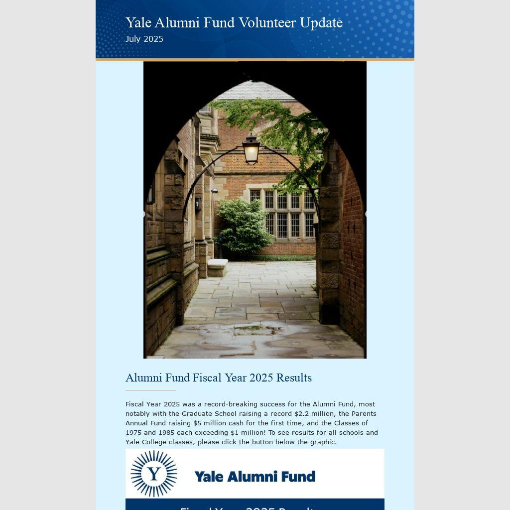 Fiscal Year 2025 was a record-breaking success for the Alumni Fund, most notably with the Graduate School raising a record $2.2 million, the Parents Annual Fund raising $5 million cash for the first time, and the Classes of 1975 and 1985 each exceeding $1 million! To see results for all schools and Yale College classes, please click the button below the graphic.