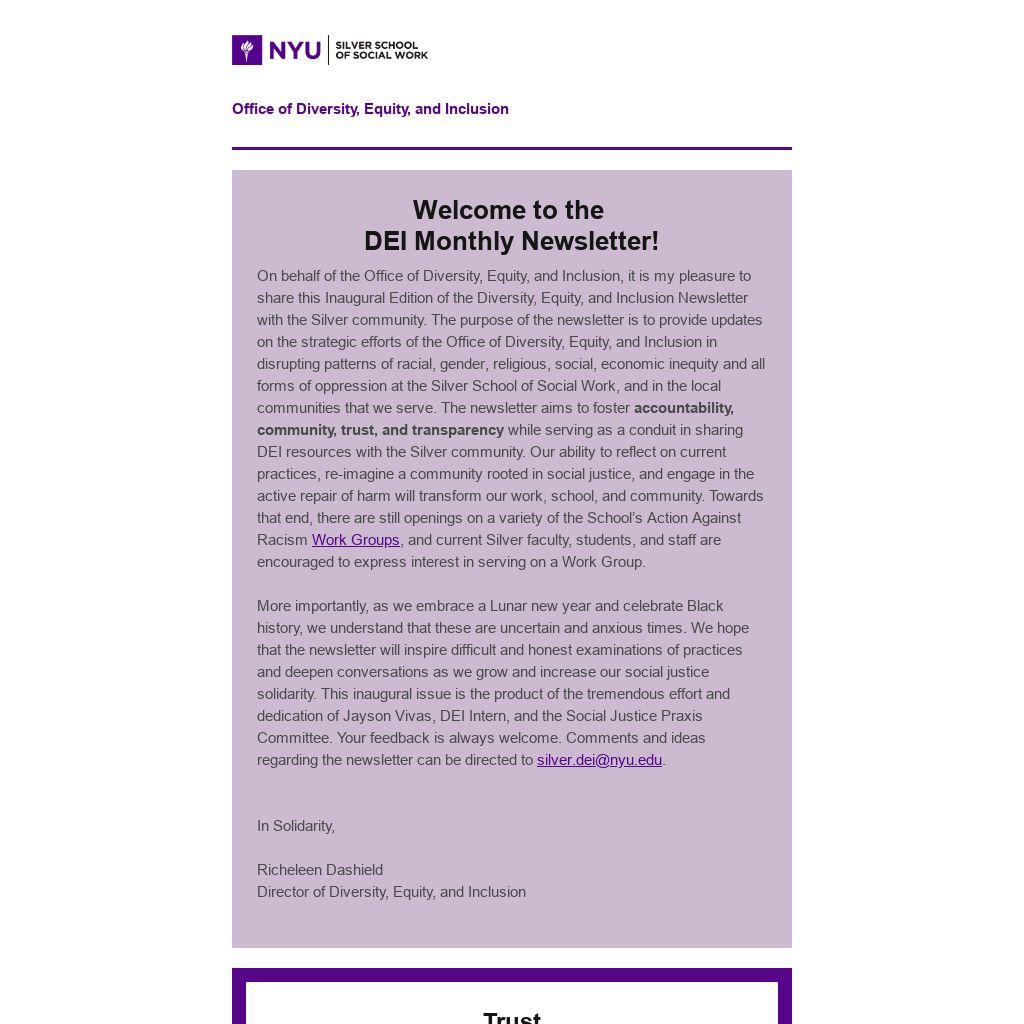 DEI Monthly Newsletter!On behalf of the Office of Diversity, Equity, and Inclusion, it is my pleasure to share this Inaugural Edition of the Diversity, Equity, and Inclusion Newsletter with the Silver community. The purpose of the newsletter is to provide updates on the strategic efforts of the Office of Diversity, Equity, and Inclusion in disrupting patterns of racial, gender, religious, social, economic inequity and all forms of oppression at the Silver School of Social Work, and in the local communities that we serve. The newsletter aims to foster accountability, community, trust, and transparency while serving as a conduit in sharing DEI resources with the Silver community. Our ability to reflect on current practices, re-imagine a community rooted in social justice, and engage in the active repair of harm will transform our work, school, and community. Towards that end, there are still openings on a variety of the School’s Action Against Racism Work Groups, and current Silver faculty, students, and staff are encouraged to express interest in serving on a Work Group.