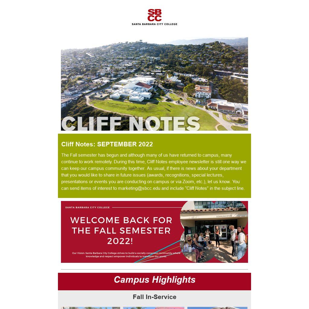 The Fall semester has begun and although many of us have returned to campus, many continue to work remotely. During this time, Cliff Notes employee newsletter is still one way we can keep our campus community together. As usual, if there is news about your department that you would like to share in future issues (awards, recognitions, special lectures, presentations or events you are conducting on campus or via Zoom, etc.), let us know. You can send items of interest to marketing@sbcc.edu and include “Cliff Notes” in the subject line.