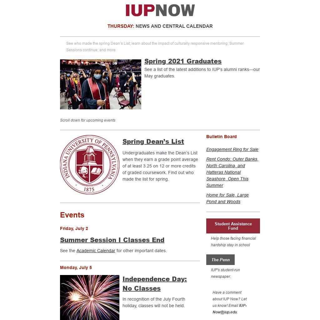 Distributed to IUP employees and students three days a week on its summer schedule, IUP Now is the official newsletter of Indiana University of Pennsylvania. It features news from across the IUP website, compiled by the Division of Marketing and Communications. Find out how to get your news and events in IUP Now.
