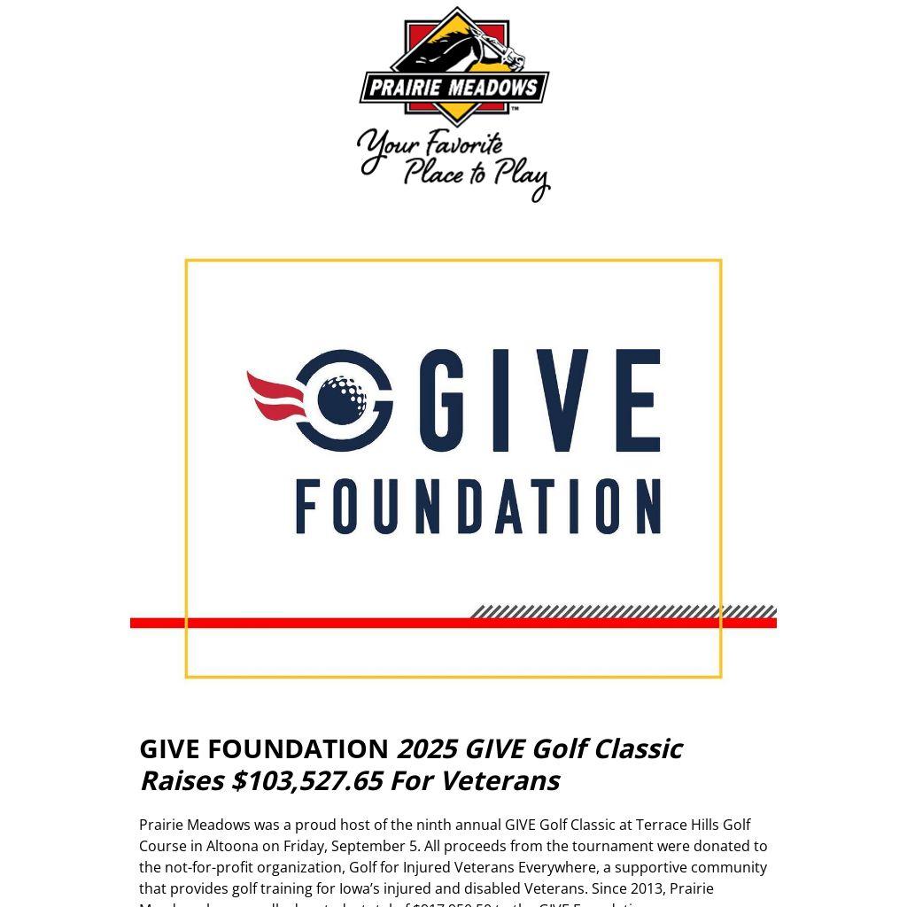 Prairie Meadows was a proud host of the ninth annual GIVE Golf Classic at Terrace Hills Golf Course in Altoona on Friday, September 5. All proceeds from the tournament were donated to the not-for-profit organization, Golf for Injured Veterans Everywhere, a supportive community that provides golf training for Iowa’s injured and disabled Veterans. Since 2013, Prairie Meadows has proudly donated a total of $917,950.50 to the GIVE Foundation.