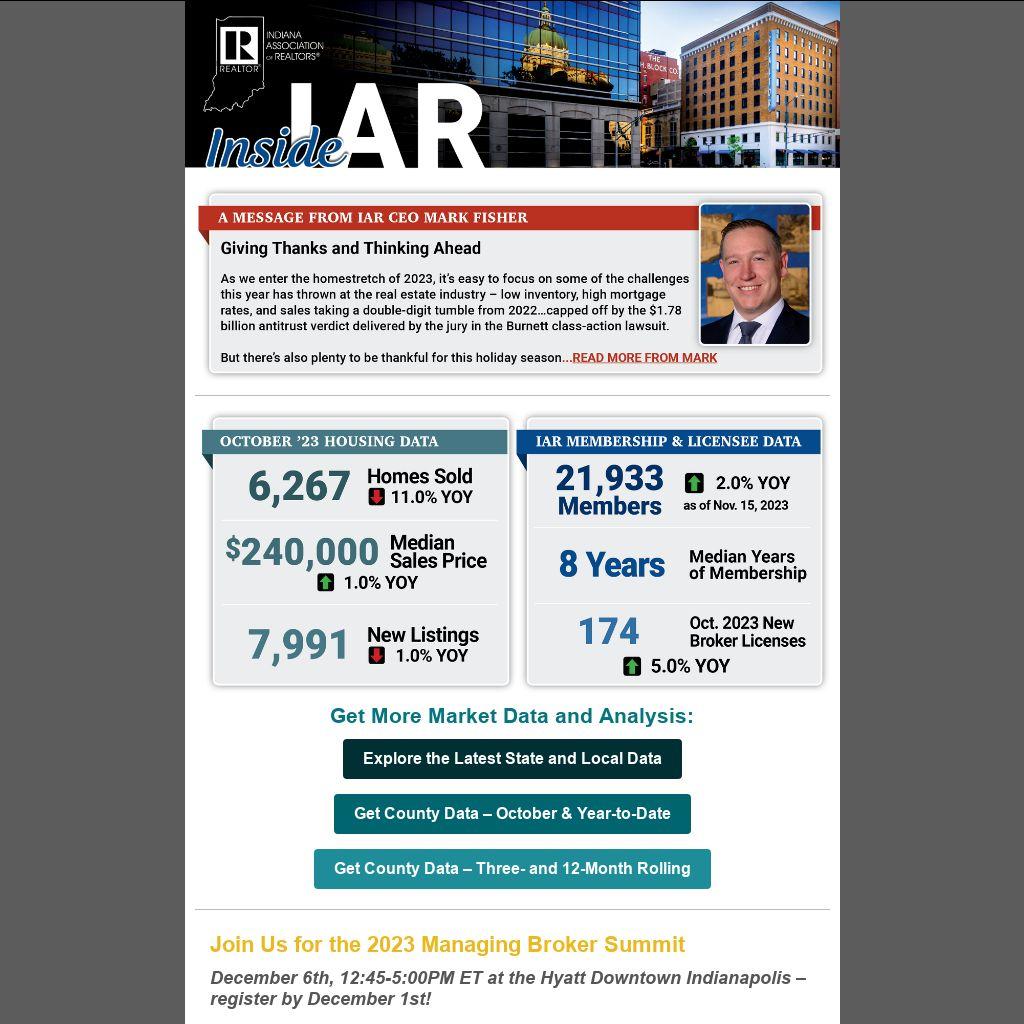 Registration for IAR’s 2023 Managing Broker Summit is open to all Indiana managing brokers and state and local association leadership as we discuss post-lawsuit protections for brokerages, buyer representation and MLS marketplaces.
