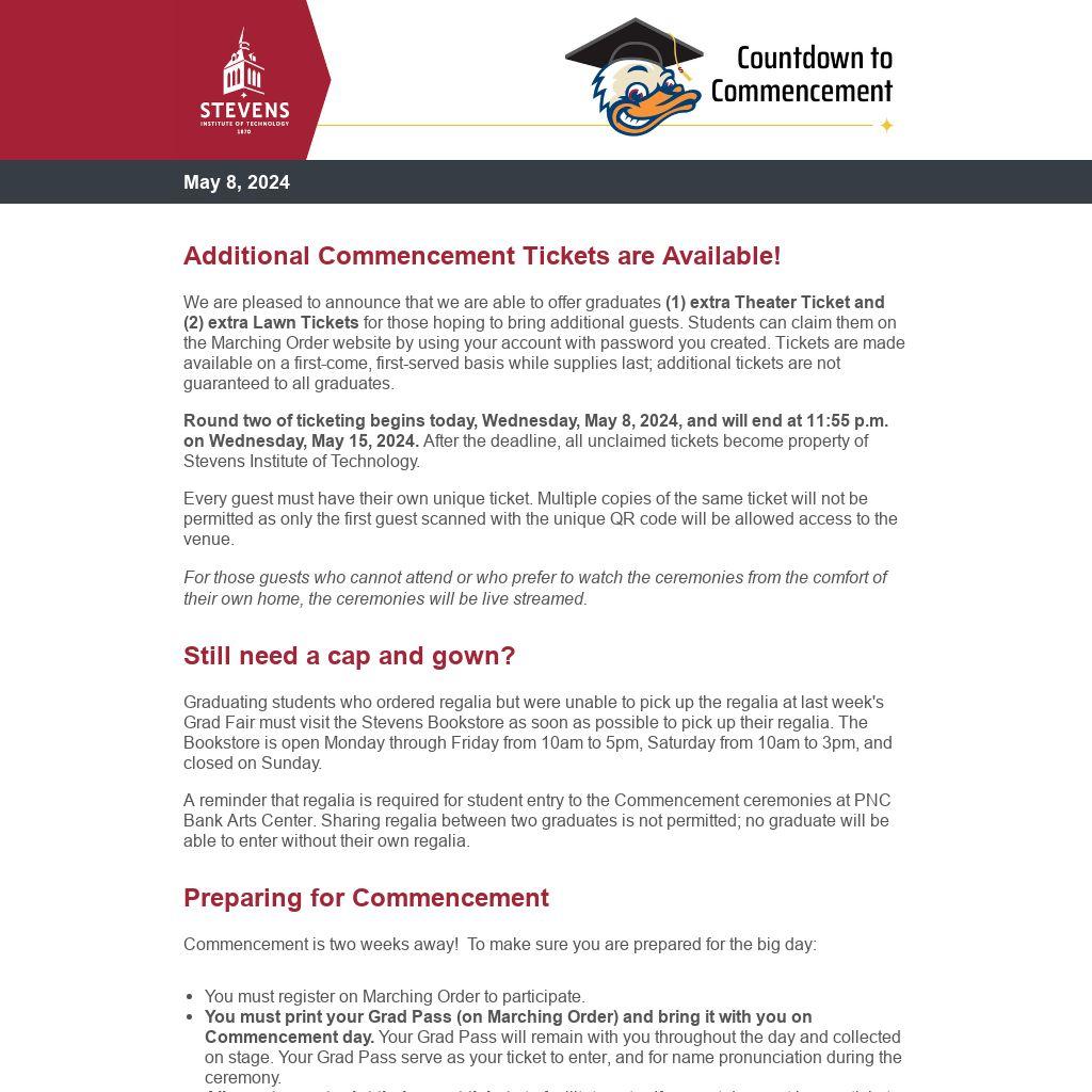 Round two of ticketing begins today, Wednesday, May 8, 2024, and will end at 11:55 p.m. on Wednesday, May 15, 2024. After the deadline, all unclaimed tickets become property of Stevens Institute of Technology.