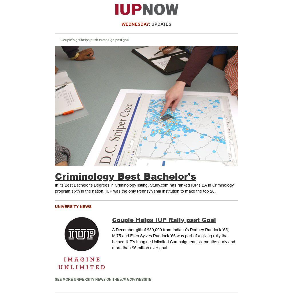 Distributed to IUP employees and students three days a week on its summer schedule, IUP Now is the official newsletter of Indiana University of Pennsylvania. It features news from across the IUP website, compiled by the Division of Marketing and Communications. Find out how to get your news and events in IUP Now.