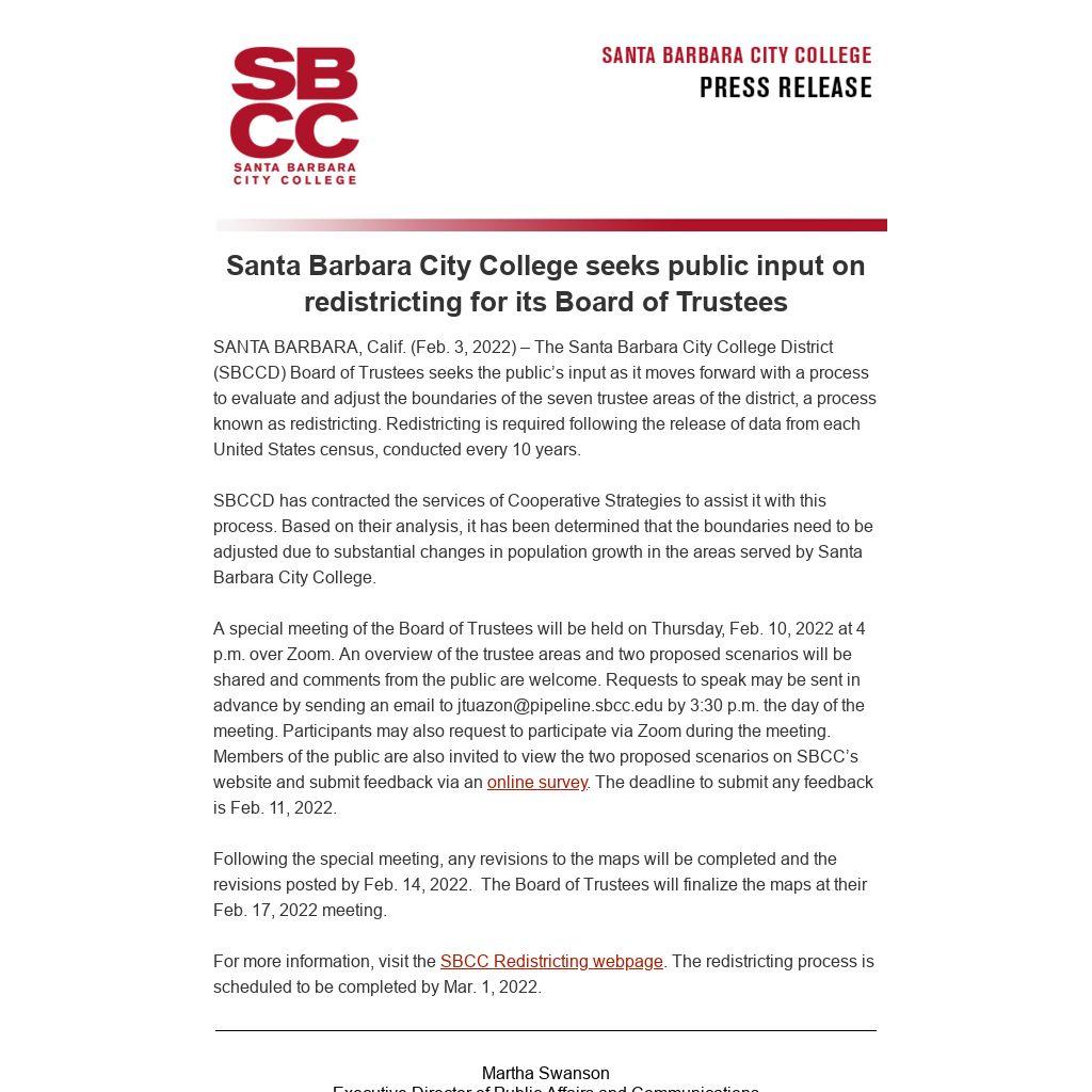 A special meeting of the Board of Trustees will be held on Thursday, Feb. 10, 2022 at 4 p.m. over Zoom. An overview of the trustee areas and two proposed scenarios will be shared and comments from the public are welcome. Requests to speak may be sent in advance by sending an email to jtuazon@pipeline.sbcc.edu by 3:30 p.m. the day of the meeting. Participants may also request to participate via Zoom during the meeting. Members of the public are also invited to view the two proposed scenarios on SBCC’s website and submit feedback via an online survey. The deadline to submit any feedback is Feb. 11, 2022.