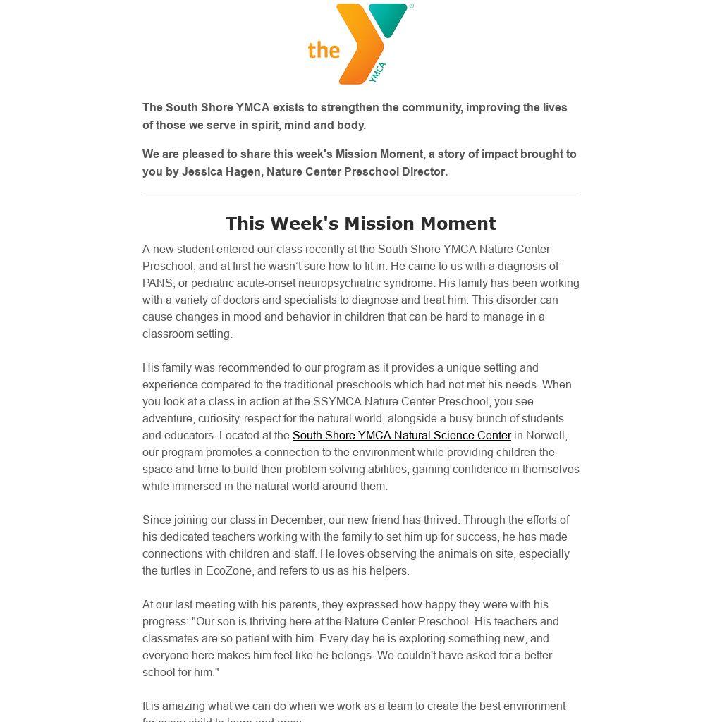The South Shore YMCA exists to strengthen the community, improving the lives of those we serve in spirit, mind and body.