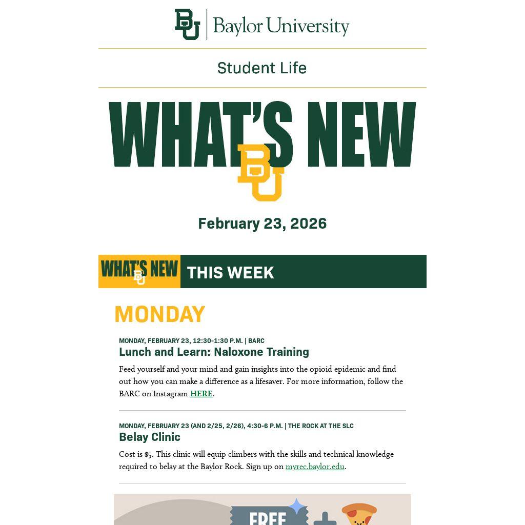 If you are a department or Baylor student organization and have items you would like to see appear in What's New BU, submit them for consideration by Friday at 8 a.m. by clicking here or emailing them to whatsnew@baylor.edu. View past issues of What’s New BU here.