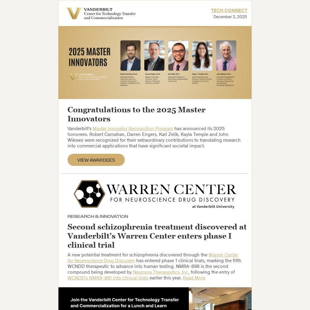 Vanderbilt's Master Innovator Recognition Program has announced its 2025 honorees. Robert Carnahan, Darren Engers, Karl Zelik, Kayla Temple and John Wikswo were recognized for their extraordinary contributions to translating research into commercial applications that have significant societal impact.