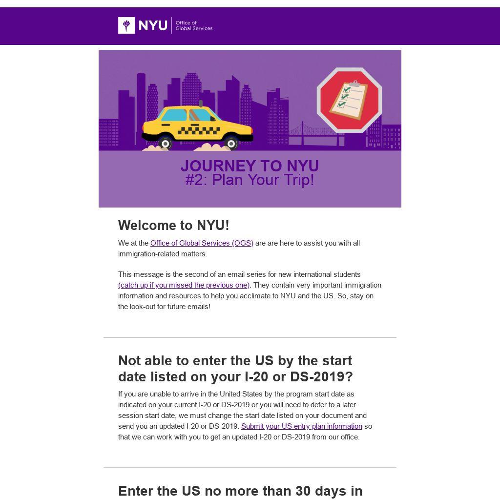Enter the country no earlier than 30 days before and no later than the start date indicated on your I-20/DS-2019. We understand that you may want to arrive earlier to prepare for school, however US law prohibits you from doing so. The only exception is for students who have transferred to NYU from another US school.