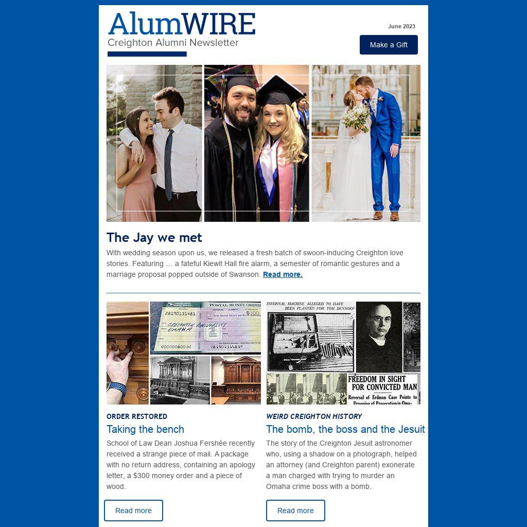 With wedding season upon us, we released a fresh batch of swoon-inducing Creighton love stories. Featuring … a fateful Kiewit Hall fire alarm, a semester of romantic gestures and a marriage proposal popped outside of Swanson. Read more.
