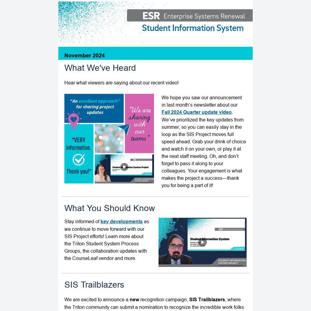 Stay informed of key developments as we continue to move forward with our SIS Project efforts! Learn more about the Triton Student System Process Groups, the collaboration updates with the CourseLeaf vendor and more.