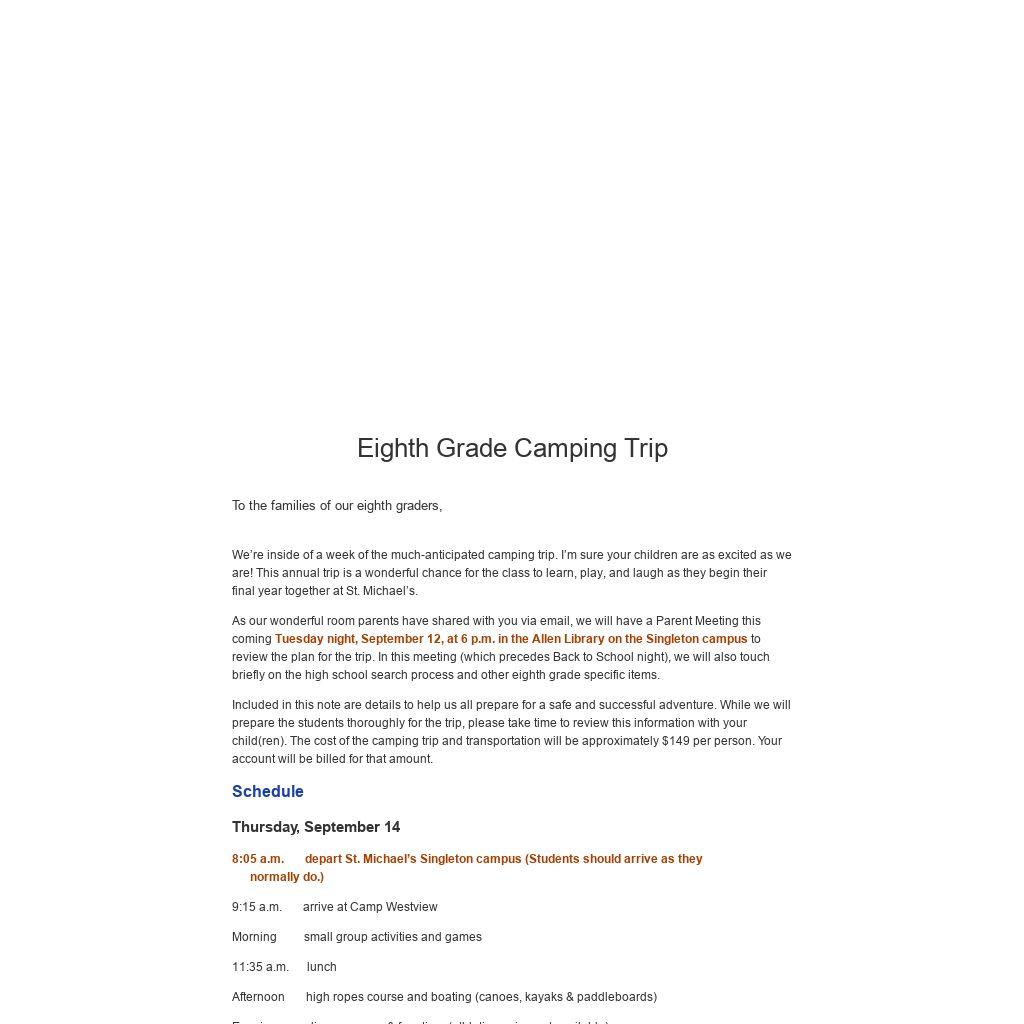 Families are asked to park in the lower (gym) lot while awaiting the bus’s return. Please do not arrive too early as extra cars will clog carline for families of 6th and 7th graders. Updated estimated time of arrival will be posted on the School’s Facebook page and Twitter feed.