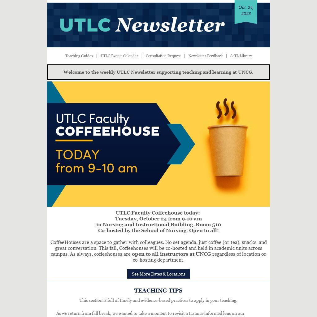 | ☕️ UTLC Coffeehouse | Nursing and Instructional Building (Room 510) co-hosted by the College of Nursing