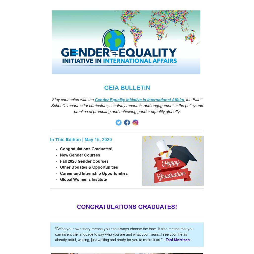 Your accomplishments are especially impressive given the current uncertainty in global affairs, and we are inspired by your resiliency and optimism. We are also grateful for your dedication to gender equality, and we know that you enter this next chapter with the tools and knowledge to be agents of change. While the Covid-19 pandemic has impacted our ability to celebrate your achievements in person, we trust you will continue leveraging your intelligence, resources, and compassion to turn this diffcult time into an opportunity for positive social transformation. We look forward to your future endeavors and welcome your ongoing engagement with the GEIA community!