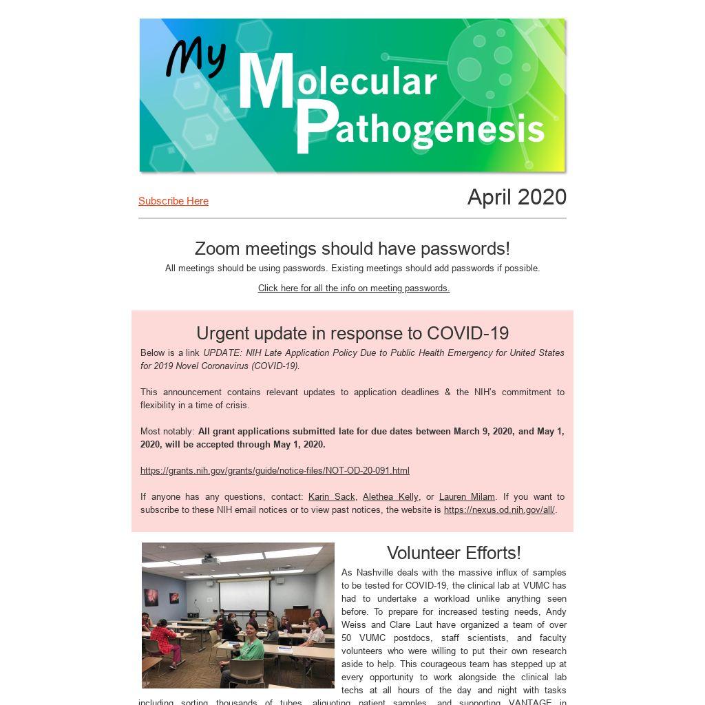 Volunteer Efforts!As Nashville deals with the massive influx of samples to be tested for COVID-19, the clinical lab at VUMC has had to undertake a workload unlike anything seen before. To prepare for increased testing needs, Andy Weiss and Clare Laut have organized a team of over 50 VUMC postdocs, staff scientists, and faculty volunteers who were willing to put their own research aside to help. This courageous team has stepped up at every opportunity to work alongside the clinical lab techs at all hours of the day and night with tasks including sorting thousands of tubes, aliquoting patient samples, and supporting VANTAGE in therapeutic development, among others. They are helping the incredible clinical technicians who are working nonstop to provide our community with results for thousands of patient samples. We cannot thank our clinical laboratory and these volunteers enough. It is a true testament to the collaborative spirit of the PMI and the VUMC community.