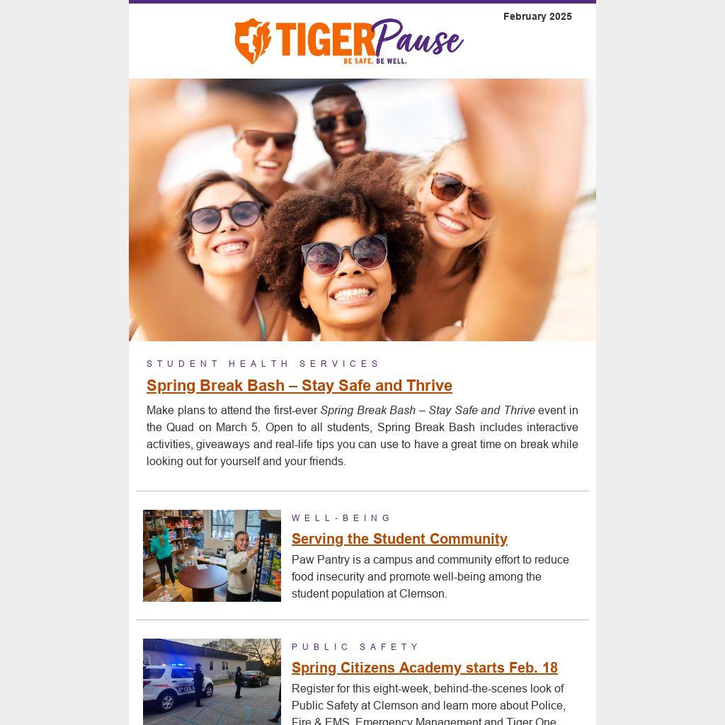 Make plans to attend the first-ever Spring Break Bash – Stay Safe and Thrive event in the Quad on March 5. Open to all students, Spring Break Bash includes interactive activities, giveaways and real-life tips you can use to have a great time on break while looking out for yourself and your friends.