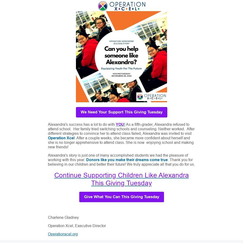 Alexandra's success has a lot to do with YOU! As a fifth-grader, Alexandra refused to attend school. Her family tried switching schools and counseling. Neither worked. After different strategies to convince her to attend class failed, Alexandra was invited to visit Operation Xcel After a couple weeks, she became more confident about herself and she is no longer apprehensive to attend class. She is now enjoying school and making new friends!