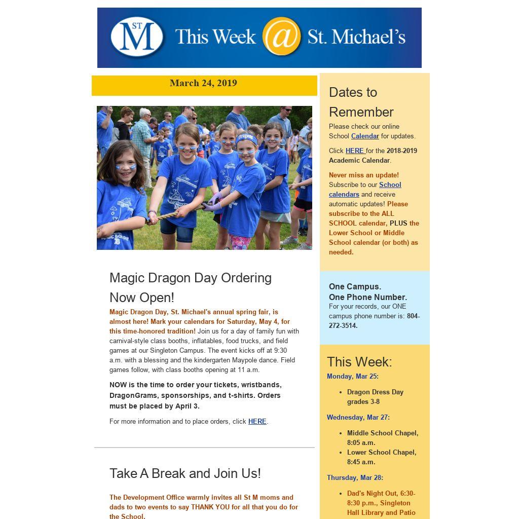 Magic Dragon Day Ordering Now Open!Magic Dragon Day, St. Michael's annual spring fair, is almost here! Mark your calendars for Saturday, May 4, for this time-honored tradition! Join us for a day of family fun with carnival-style class booths, inflatables, food trucks, and field games at our Singleton Campus. The event kicks off at 9:30 a.m. with a blessing and the kindergarten Maypole dance. Field games follow, with class booths opening at 11 a.m. NOW is the time to order your tickets, wristbands, DragonGrams, sponsorships, and t-shirts. Orders must be placed by April 3. For more information and to place orders, click HERE.