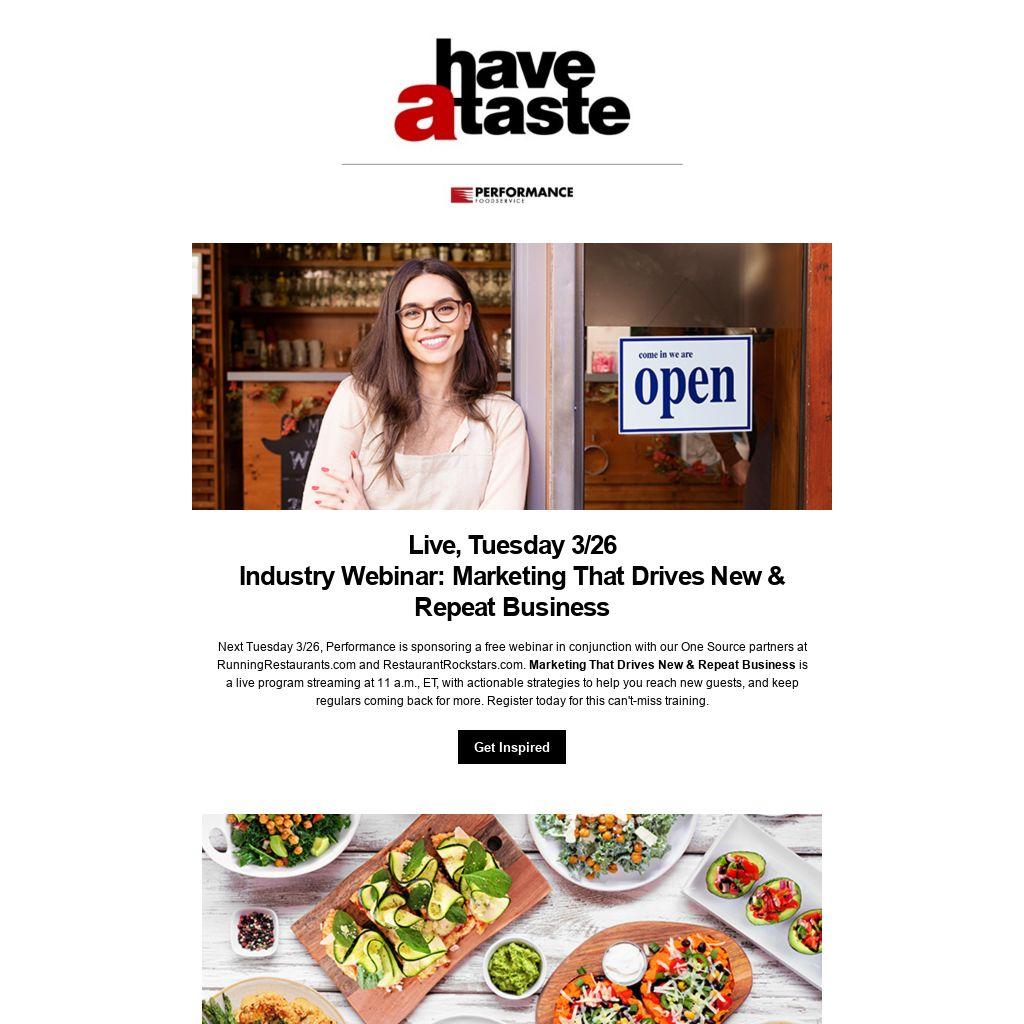Next Tuesday 3/26, Performance is sponsoring a free webinar in conjunction with our One Source partners at RunningRestaurants.com and RestaurantRockstars.com. Marketing That Drives New & Repeat Business is a live program streaming at 11 a.m., ET, with actionable strategies to help you reach new guests, and keep regulars coming back for more. Register today for this can't-miss training.