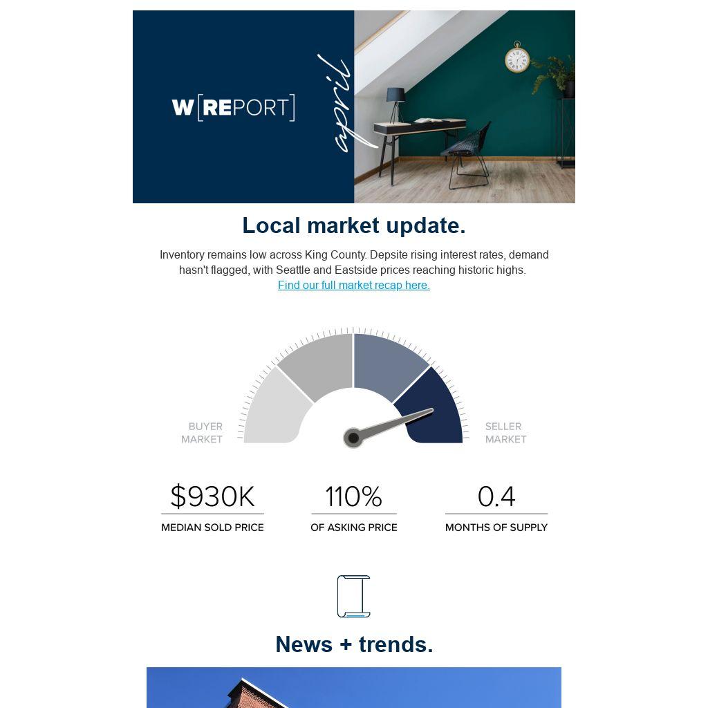 Inventory remains low across King County. Depsite rising interest rates, demand hasn't flagged, with Seattle and Eastside prices reaching historic highs. Find our full market recap here.