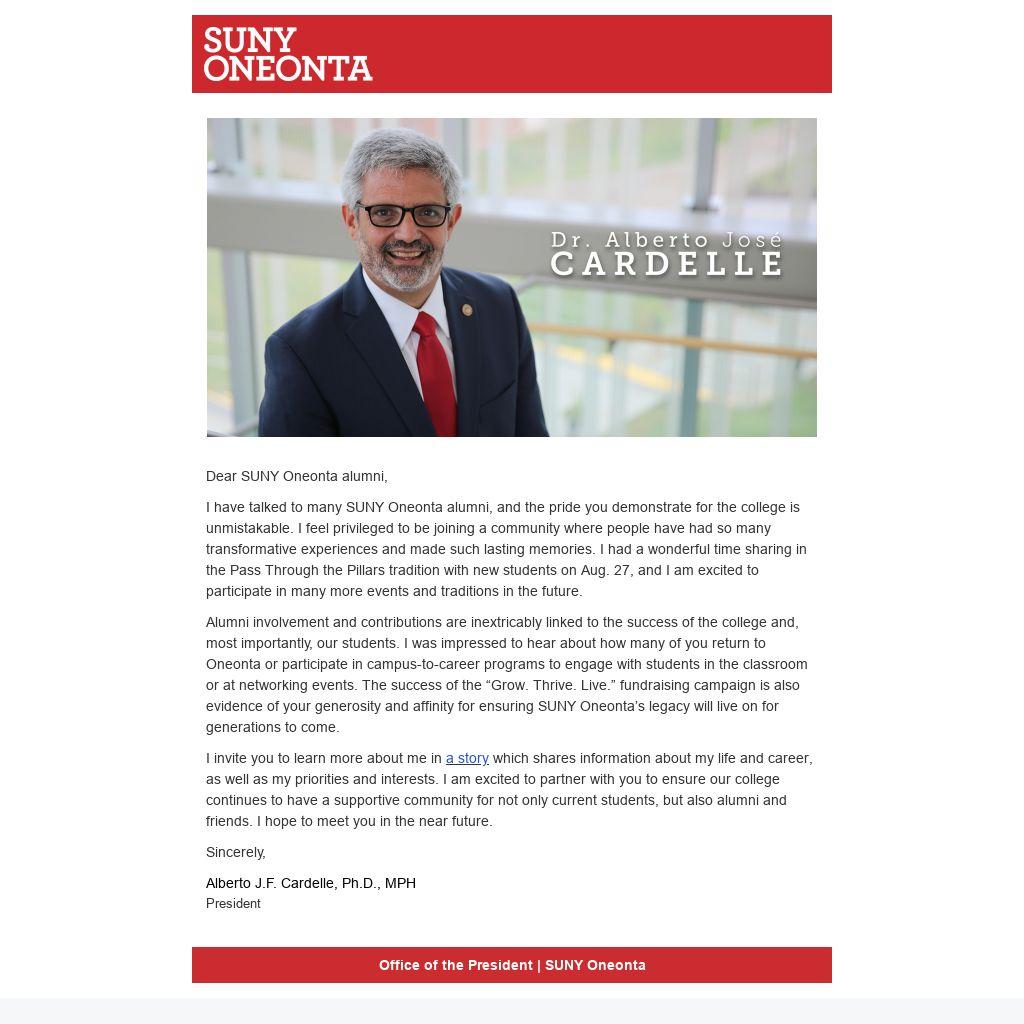 I have talked to many SUNY Oneonta alumni, and the pride you demonstrate for the college is unmistakable. I feel privileged to be joining a community where people have had so many transformative experiences and made such lasting memories. I had a wonderful time sharing in the Pass Through the Pillars tradition with new students on Aug. 27, and I am excited to participate in many more events and traditions in the future.