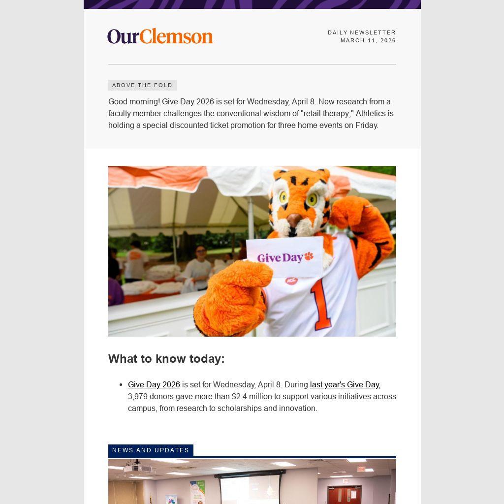 Good morning! Give Day 2026 is set for Wednesday, April 8. New research from a faculty member challenges the conventional wisdom of "retail therapy;" Athletics is holding a special discounted ticket promotion for three home events on Friday.
