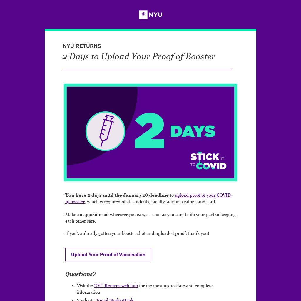 upload proof of your COVID-19 booster, which is required of all students, faculty, administrators, and staff.