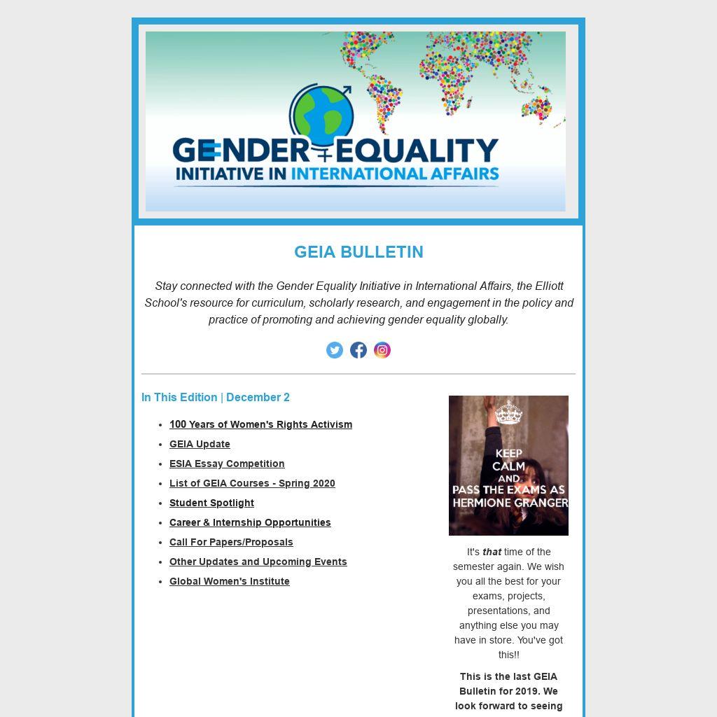 Stay connected with the Gender Equality Initiative in International Affairs, the Elliott School's resource for curriculum, scholarly research, and engagement in the policy and practice of promoting and achieving gender equality globally.