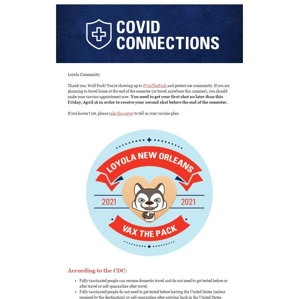 Ochsner Health is hosting a vaccine event for Loyola community members tomorrow at Mercy Hall. Appointments preferred, walk-ins welcome. Call 844-888-2772 or make your