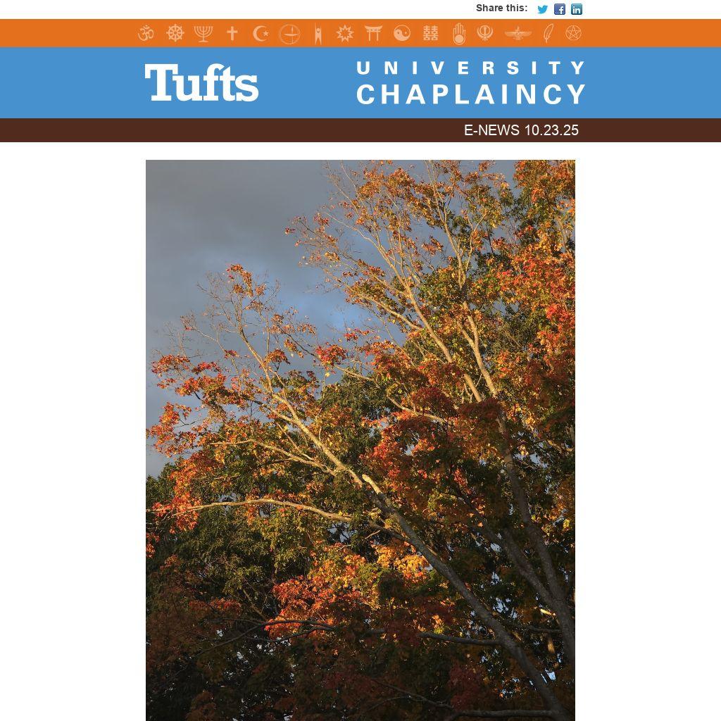 We hope you are looking forward to a sunny fall weekend! For those on the Medford campus, this is Family and Friends Weekend, when you might get to introduce any visitors to your favorite places and people on campus. If you are planning to bring anyone to Goddard Chapel, bookmark our history page to answer any questions! We will host our open house Friday, October 24, from 4:00 p.m. - 5:00 p.m. - we hope you can stop by. You can find a full list of our events this weekend through the link below, and find Hillel's on their website.