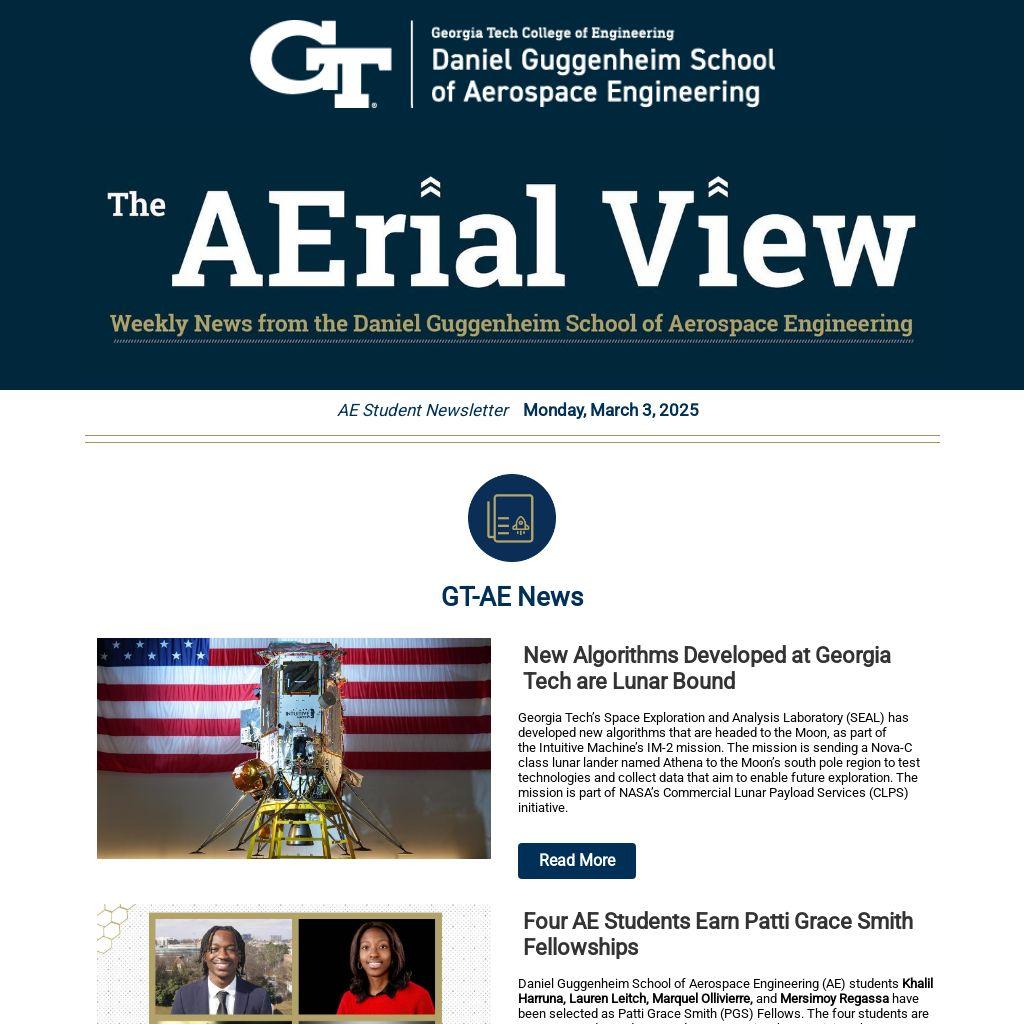 Daniel Guggenheim School of Aerospace Engineering (AE) students Khalil Harruna, Lauren Leitch, Marquel Ollivierre, and Mersimoy Regassa have been selected as Patti Grace Smith (PGS) Fellows. The four students are among 35 undergraduate students to receive the prestigious honor across the country. In addition to scholarships, these students will intern this summer at top aerospace companies around the nation. They will also receive personalized mentorship, networking opportunities, and career guidance.