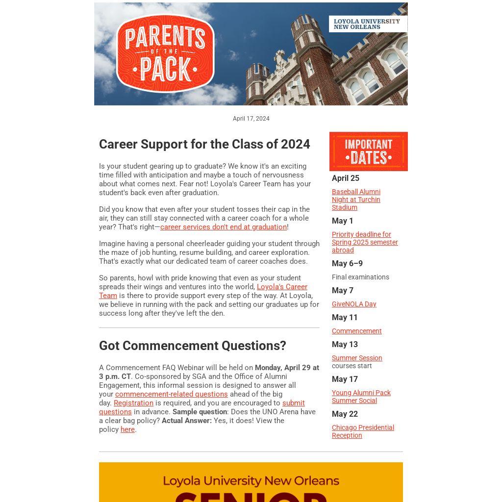 Is your student gearing up to graduate? We know it's an exciting time filled with anticipation and maybe a touch of nervousness about what comes next. Fear not! Loyola's Career Team has your student's back even after graduation.