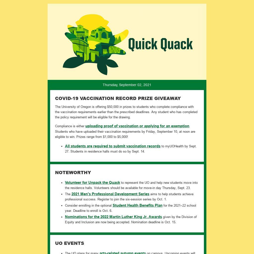 The University of Oregon is offering $50,000 in prizes to students who complete compliance with the vaccination requirements earlier than the prescribed deadlines. Any student who has completed the policy requirement will be eligible for the drawing.
