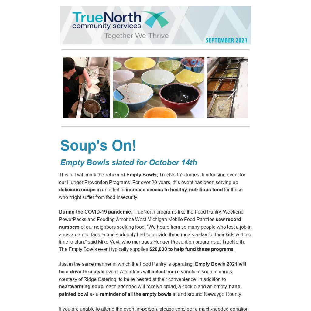 This fall will mark the return of Empty Bowls, TrueNorth’s largest fundraising event for our Hunger Prevention Programs. For over 20 years, this event has been serving up delicious soups in an effort to increase access to healthy, nutritious food for those who might suffer from food insecurity.