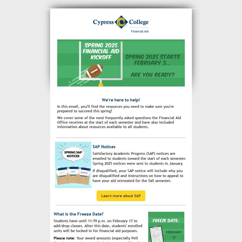 Satisfactory Academic Progress (SAP) notices are emailed to students toward the start of each semester. Spring 2025 notices were sent to students in January.