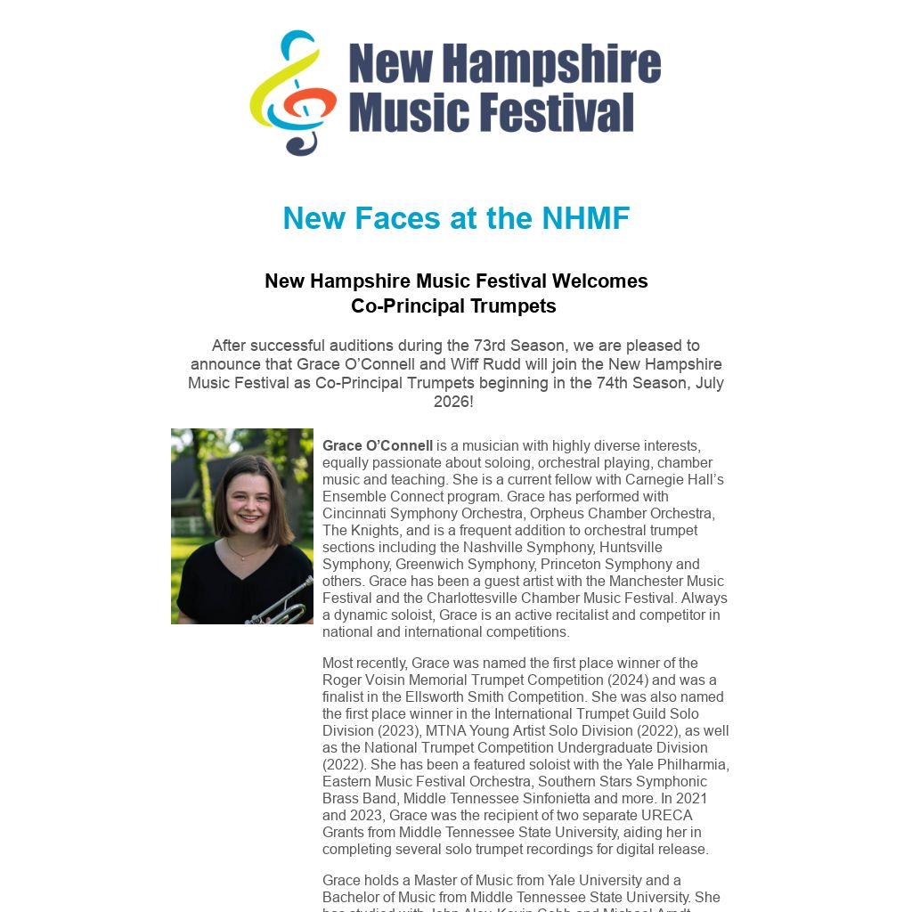 After successful auditions during the 73rd Season, we are pleased to announce that Grace O’Connell and Wiff Rudd will join the New Hampshire Music Festival as Co-Principal Trumpets beginning in the 74th Season, July 2026!