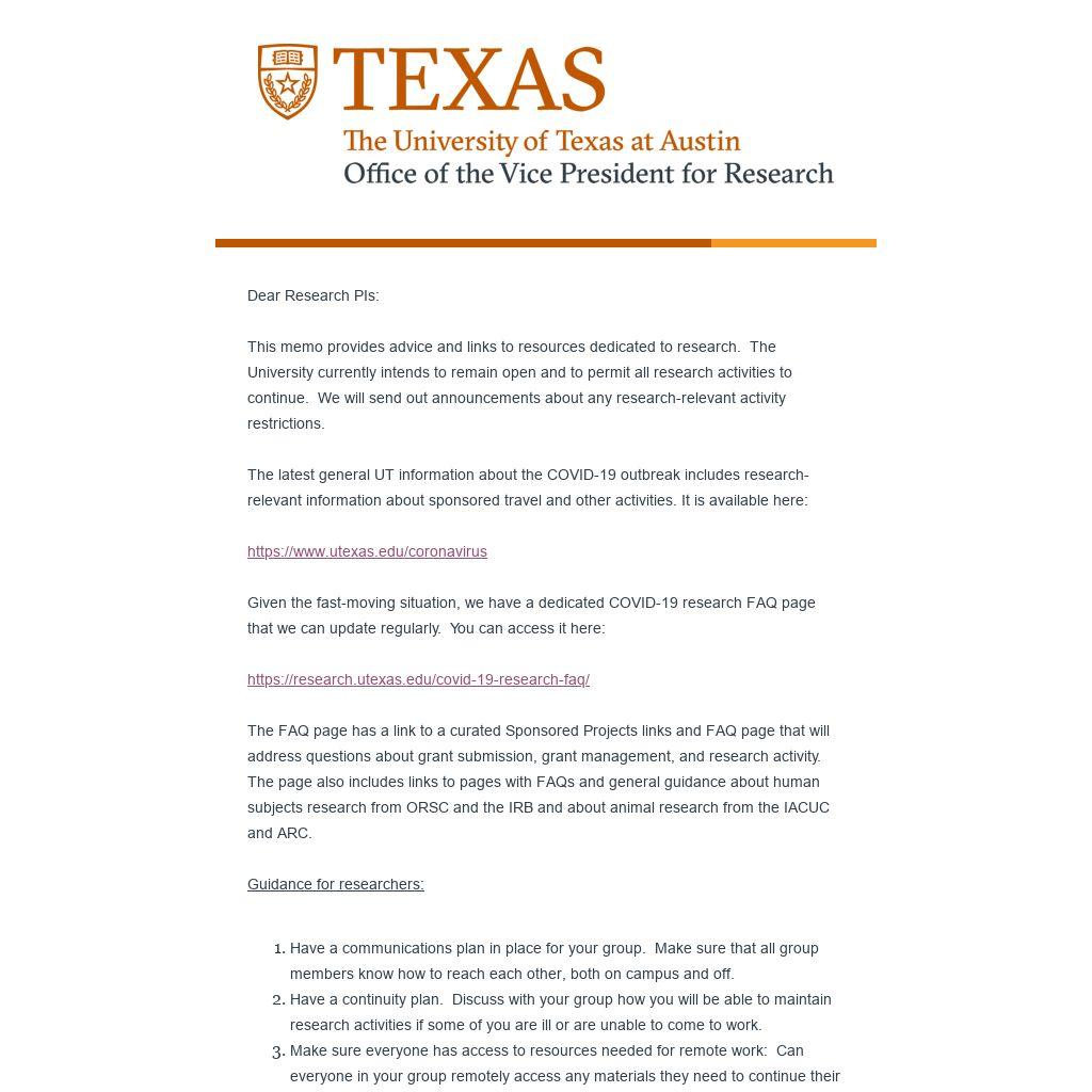 The latest general UT information about the COVID-19 outbreak includes research-relevant information about sponsored travel and other activities. It is available here:
