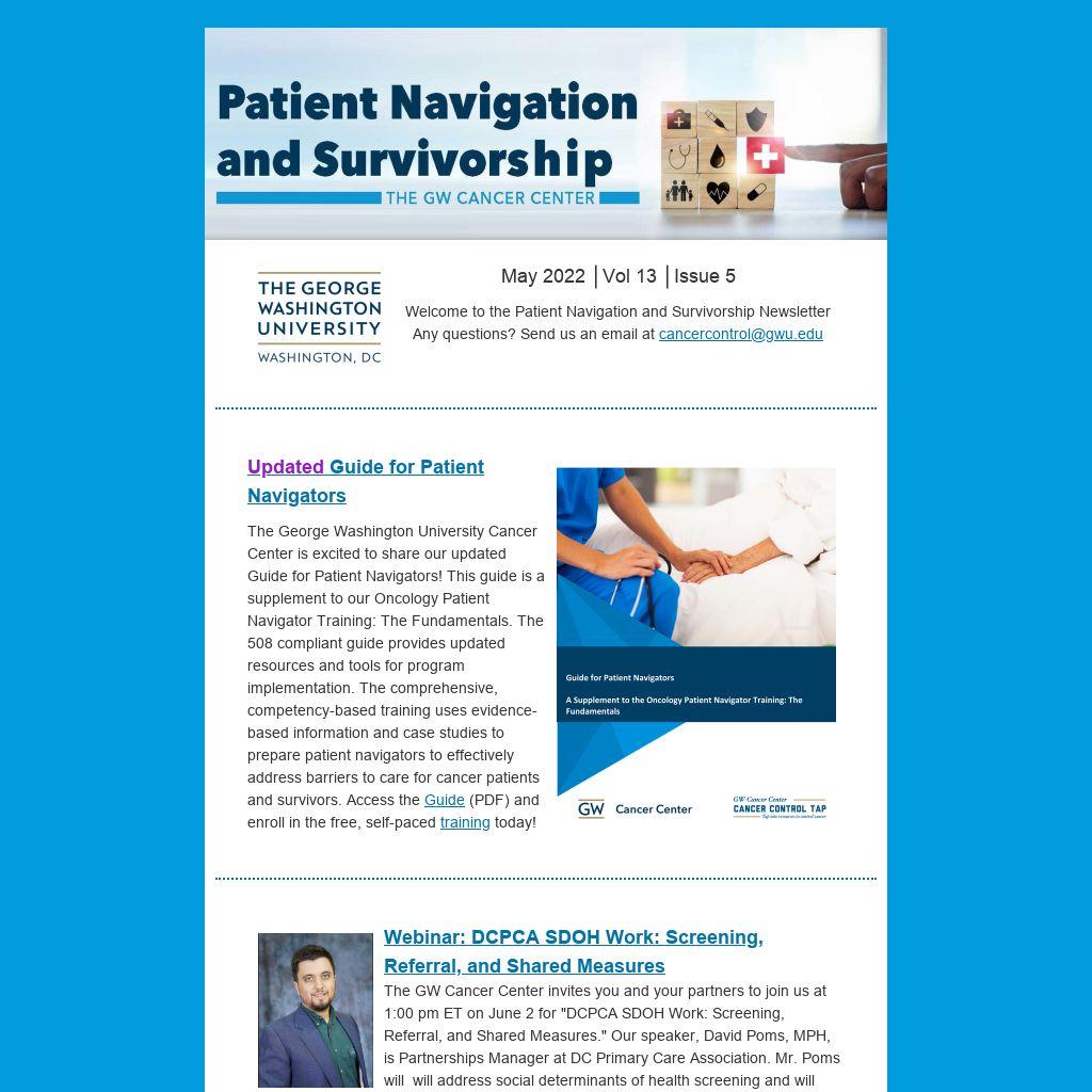 This issue of the Patient Navigation and Survivorship newsletter features a brand new style! We would love to hear your feedback on our refreshed look. Send comments, compliments or suggestions to us at cancercontrol@gwu.edu.