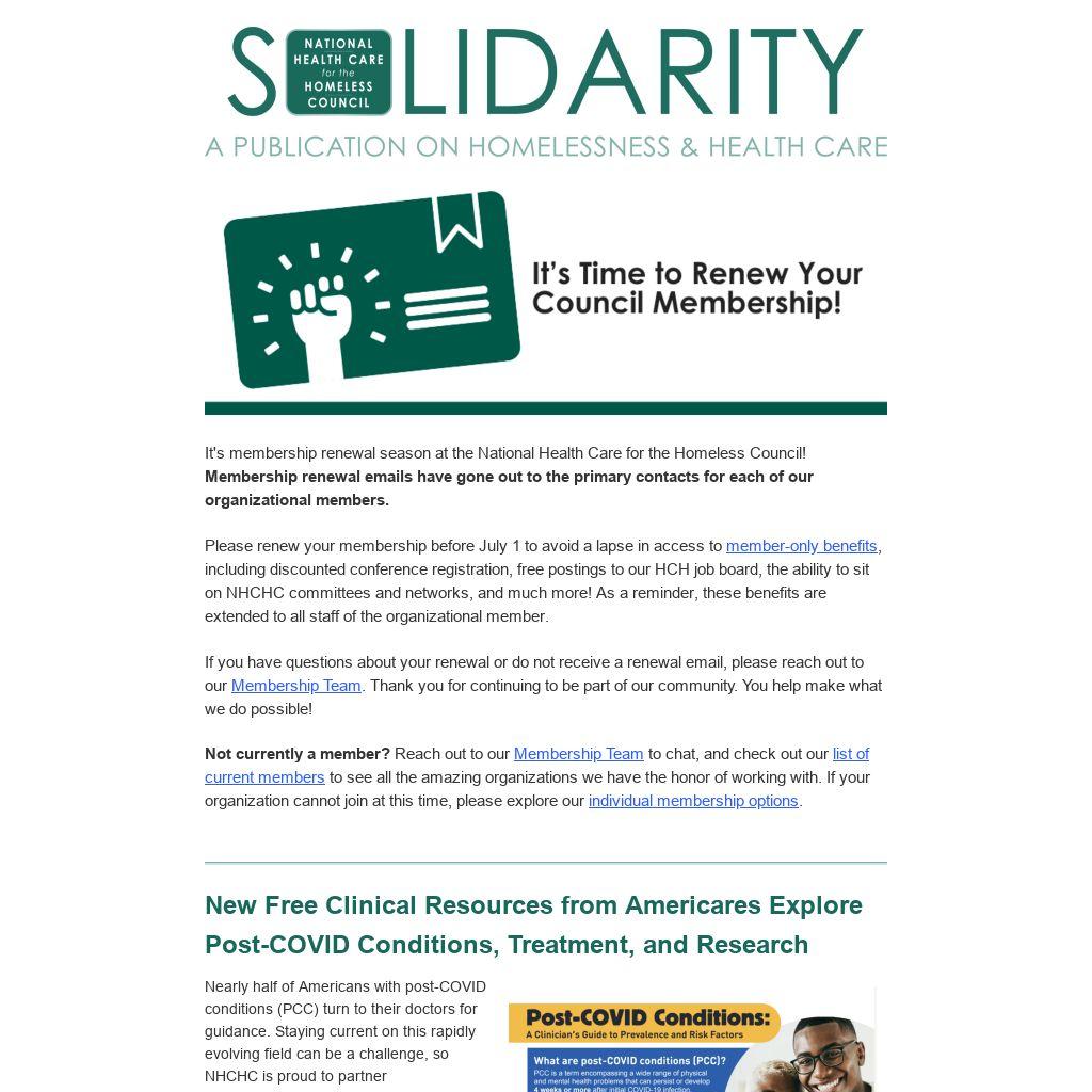 It's membership renewal season at the National Health Care for the Homeless Council! Membership renewal emails have gone out to the primary contacts for each of our organizational members.