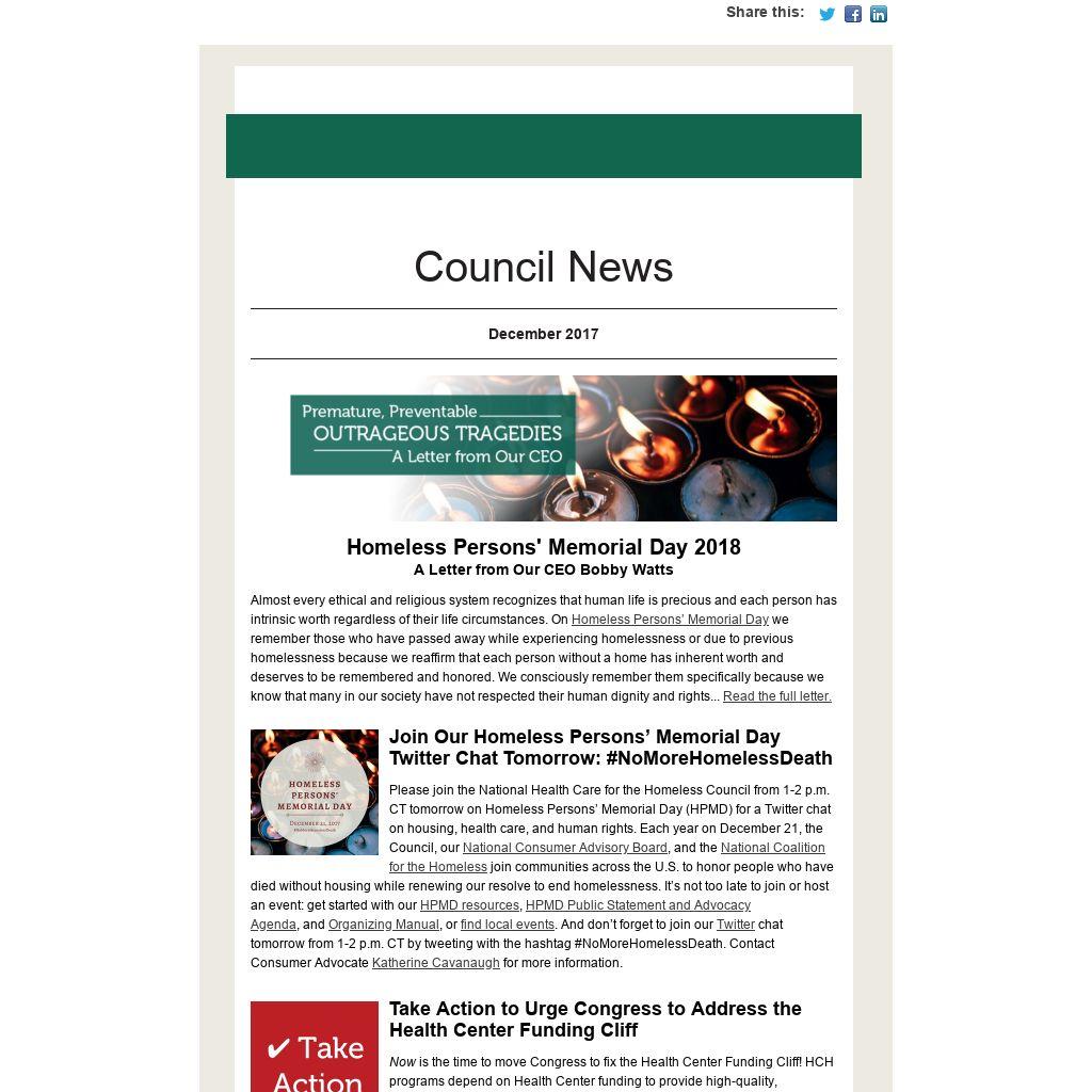 Now is the time to move Congress to fix the Health Center Funding Cliff! HCH programs depend on Health Center funding to provide high-quality, comprehensive care to people without homes, but drastic cuts will take effect in January unless Congress renews this funding. We ask everyone to take action to demand that Congress address this issue! Get involved with easy tools from our partners at the National Association of Community Health Centers and the Council’s talking points. Stay informed on policy developments by signing up for our Mobilizer action alert, and find tips on caring for yourself as you continue the struggle for health care justice in a recent issue guest-written by esteemed author and advocate Matt Bennett.