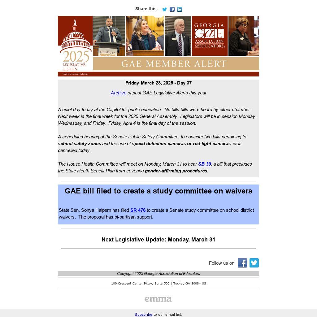 A quiet day today at the Capitol for public education.  No bills bills were heard by either chamber.  Next week is the final week for the 2025 General Assembly.  Legislators will be in session Monday, Wednesday, and Friday.  Friday, April 4 is the final day of the session.