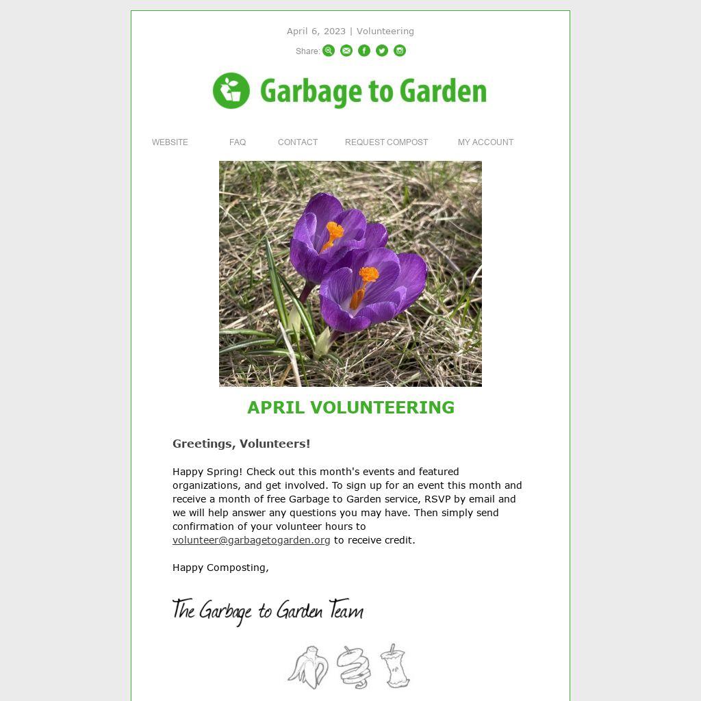 Happy Spring! Check out this month's events and featured organizations, and get involved. To sign up for an event this month and receive a month of free Garbage to Garden service, RSVP by email and we will help answer any questions you may have. Then simply send confirmation of your volunteer hours to volunteer@garbagetogarden.org to receive credit.