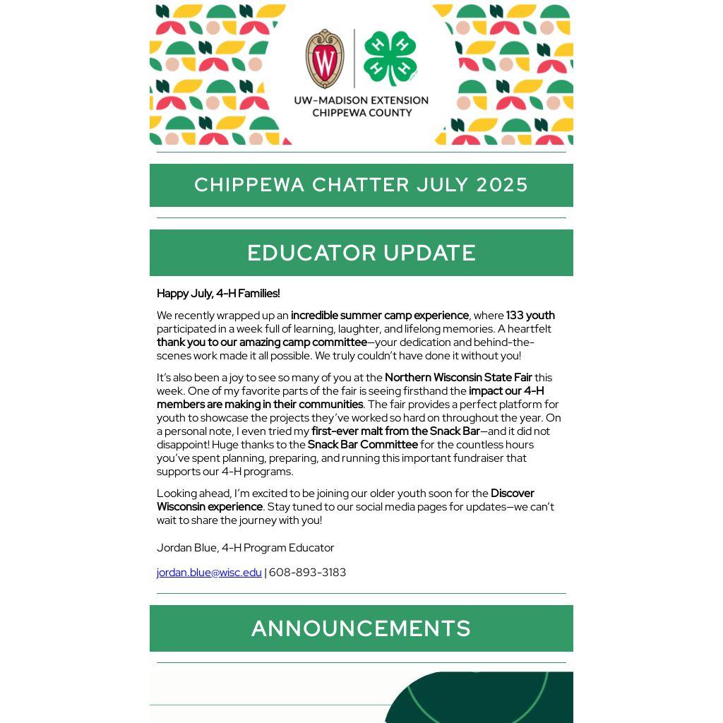 For a detailed list of upcoming county events, visit our Chippewa County 4-H Youth Development website at go.wisc.edu/chippewa4hevents. There, you can find all the details on upcoming events, important deadline reminders, and much more.
