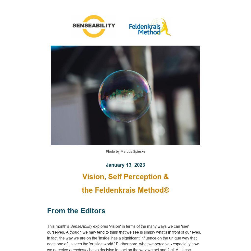 Each of our January contributors offers unique insight into how the 'self-image' can be explored and tranformed through practicing the Feldenkrais Method. Long-time practitioner Dan Clurman talks about how his teaching of Awareness Through Movement® has been influenced by a fascination with space - how we perceive it, and how our relationship to space makes us feel. Kevin Cassity, a new practitioner, shares his decades-long journey to improve his vision through practice of the Bates Method and the Feldenkrais Method. SenseAbility editor Seth Dellinger invites readers to consider the relationship between their eyes and their 'vison of the future'.