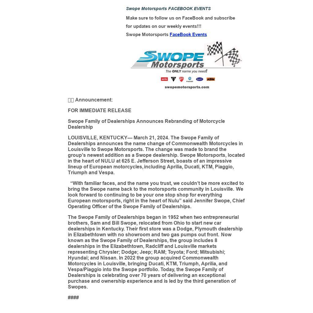 LOUISVILLE, KENTUCKY— March 21, 2024. The Swope Family of Dealerships announces the name change of Commonwealth Motorcycles in Louisville to Swope Motorsports. The change was made to brand the group’s newest addition as a Swope dealership. Swope Motorsports, located in the heart of NULU at 625 E. Jefferson Street, boasts of an impressive lineup of European motorcycles, including Aprilia, Ducati, KTM, Piaggio, Triumph and Vespa.
