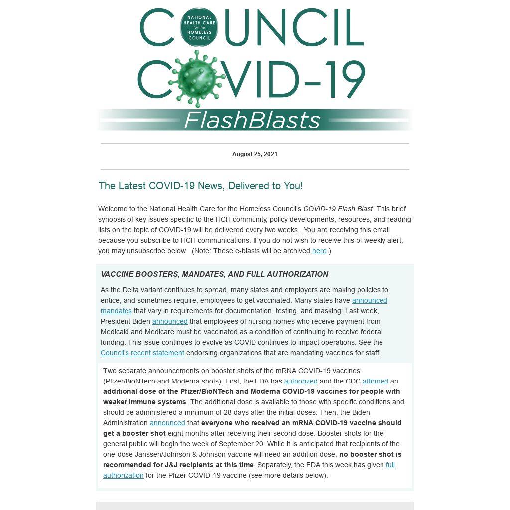 Welcome to the National Health Care for the Homeless Council’s COVID-19 Flash Blast. This brief synopsis of key issues specific to the HCH community, policy developments, resources, and reading lists on the topic of COVID-19 will be delivered every two weeks. You are receiving this email because you subscribe to HCH communications. If you do not wish to receive this bi-weekly alert, you may unsubscribe below. (Note: These e-blasts will be archived here.)