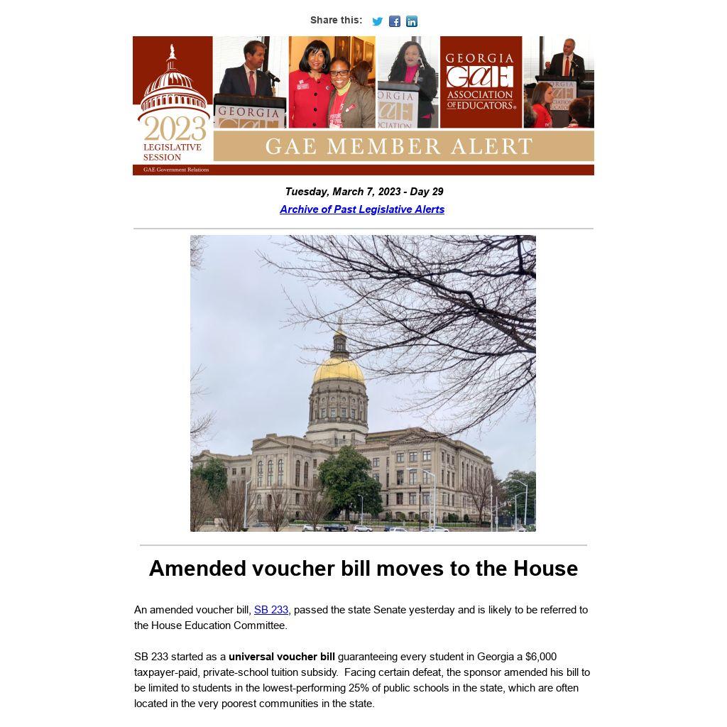 An amended voucher bill, SB 233, passed the state Senate yesterday and is likely to be referred to the House Education Committee.