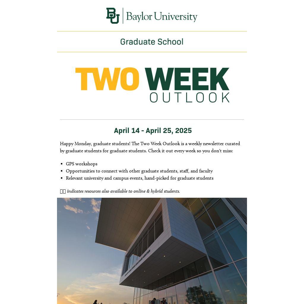 Happy Monday, graduate students! The Two Week Outlook is a weekly newsletter curated by graduate students for graduate students. Check it out every week so you don't miss: